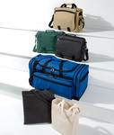 600-denier polyester • u-shaped main compartment opening • large side zip pockets • large front gusset pocket • adjustable and detachable padded shoulder strap • padded self-adhesive fabric handle wrap